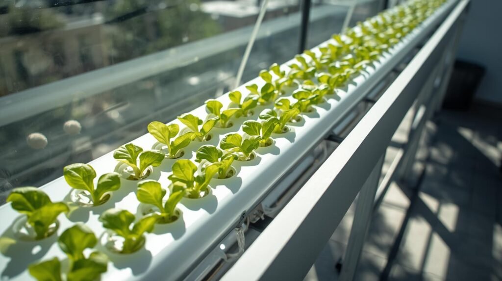 NFT uses a shallow channel where a thin stream of nutrient solution flows over plant roots. It’s compact and works well on narrow balcony ledges.