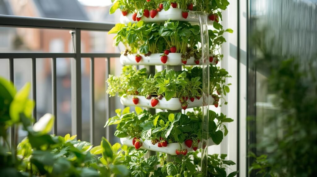 [IMAGE: Vertical hydroponic tower on a balcony corner with multiple plant types]